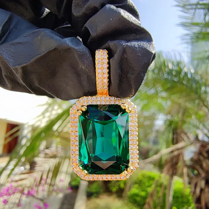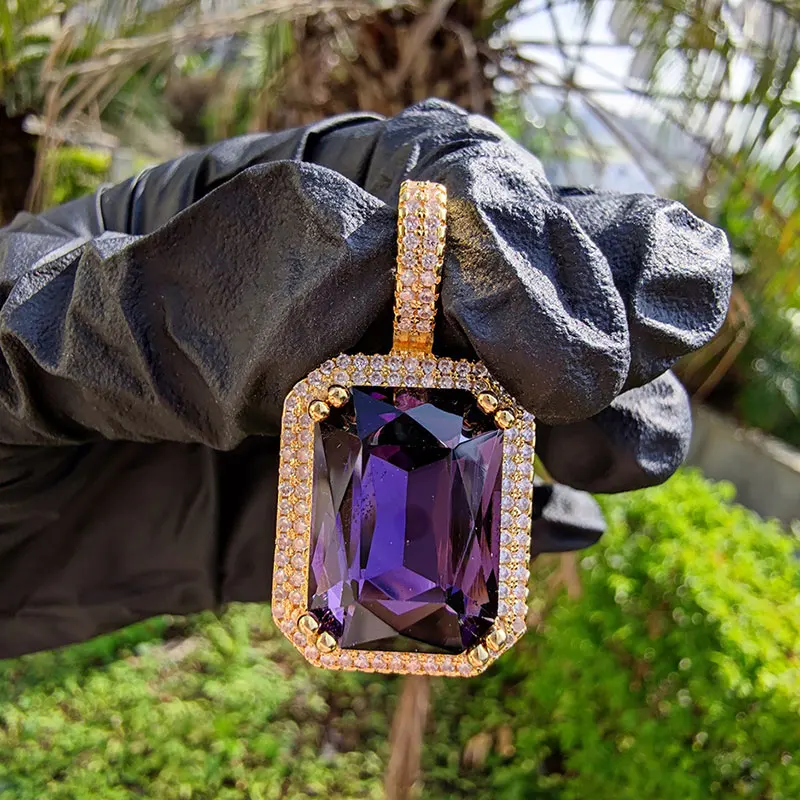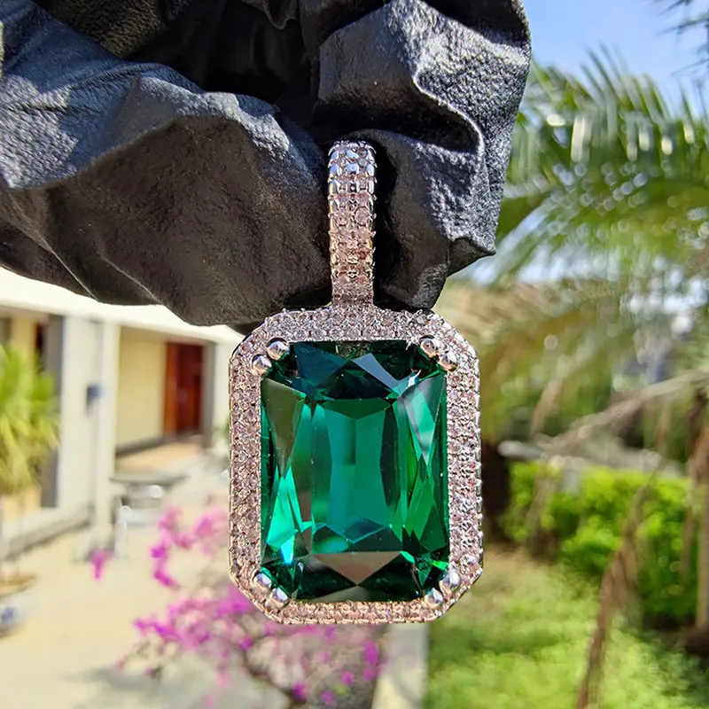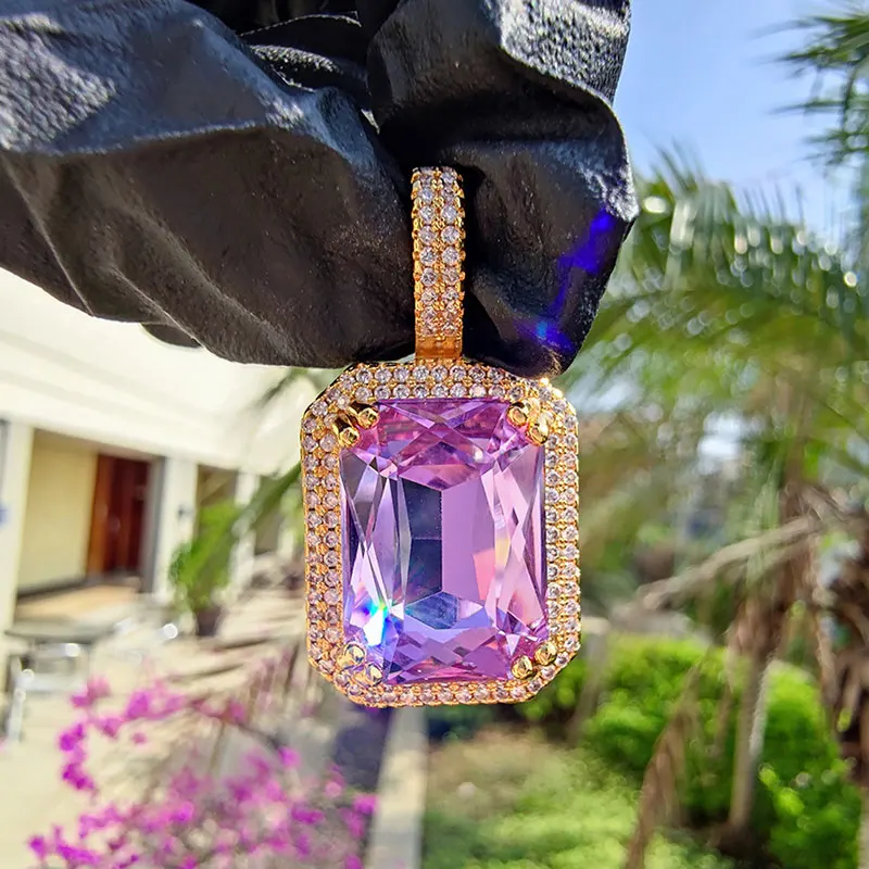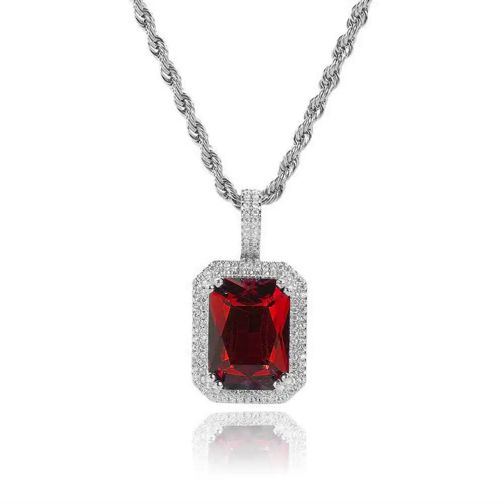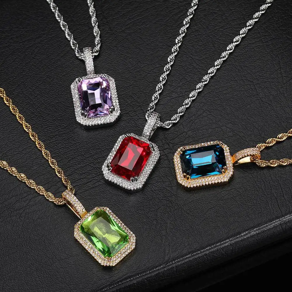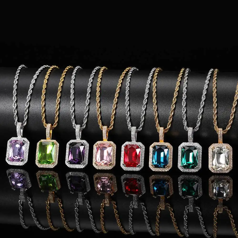 Dainty Luxury Bezel Birthstone Stone Pendant Necklace Iced Out CZ Black Sapphire Emerald Ruby Gemstone Pendant With Rope Chain