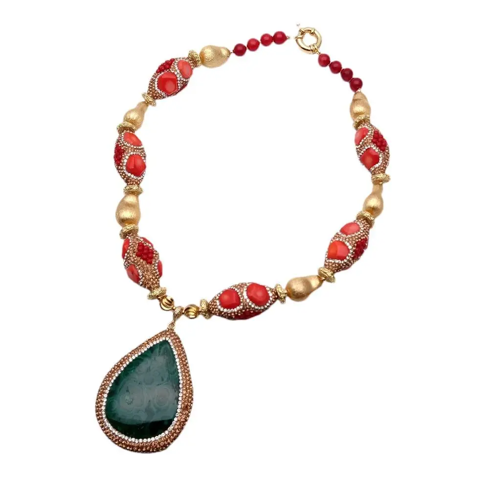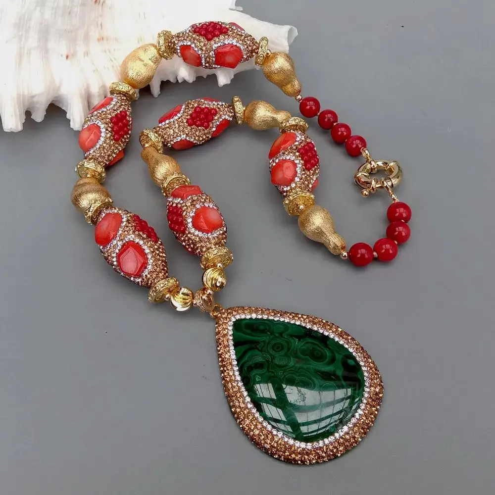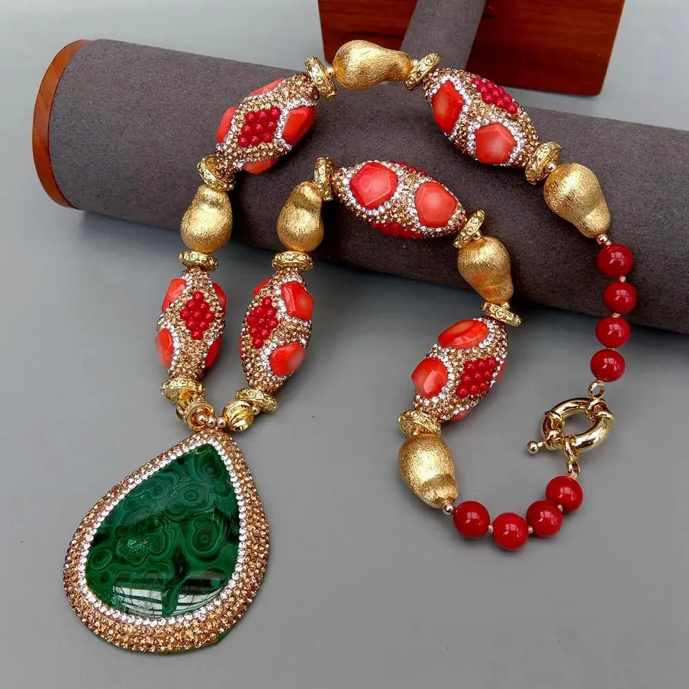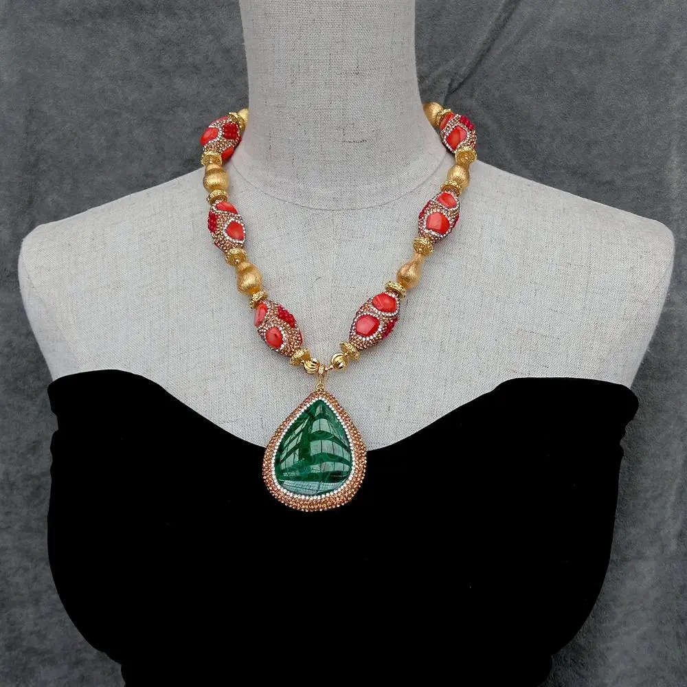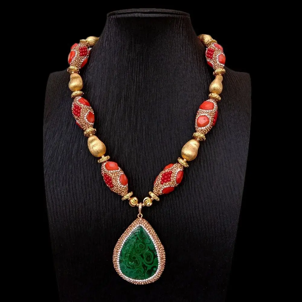 Gems Info: red and orange coral trimmed with golden crystal, natural green malachite pendant.