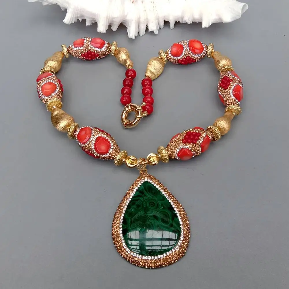 Red Coral Crystal Pave Brushed Bead Necklace Real Green Malachite Pendant 20"