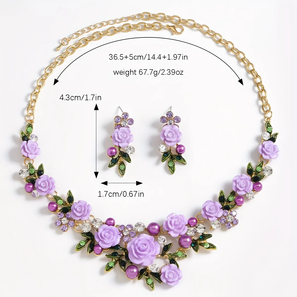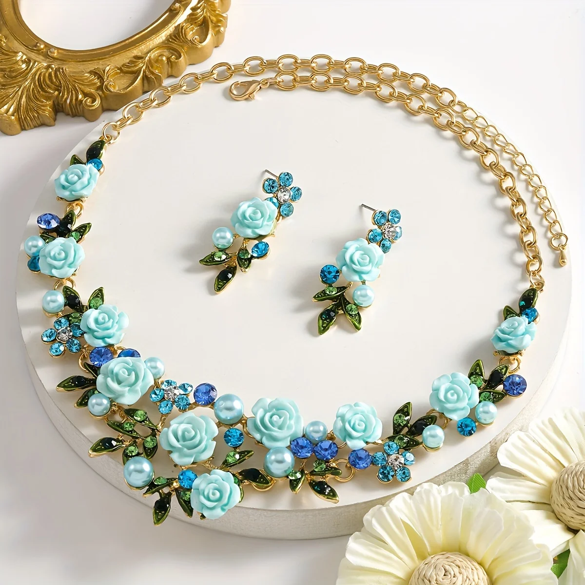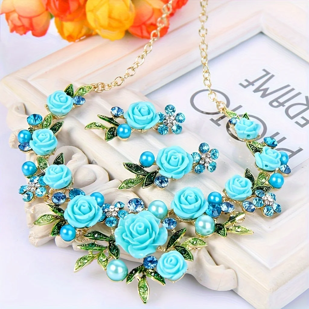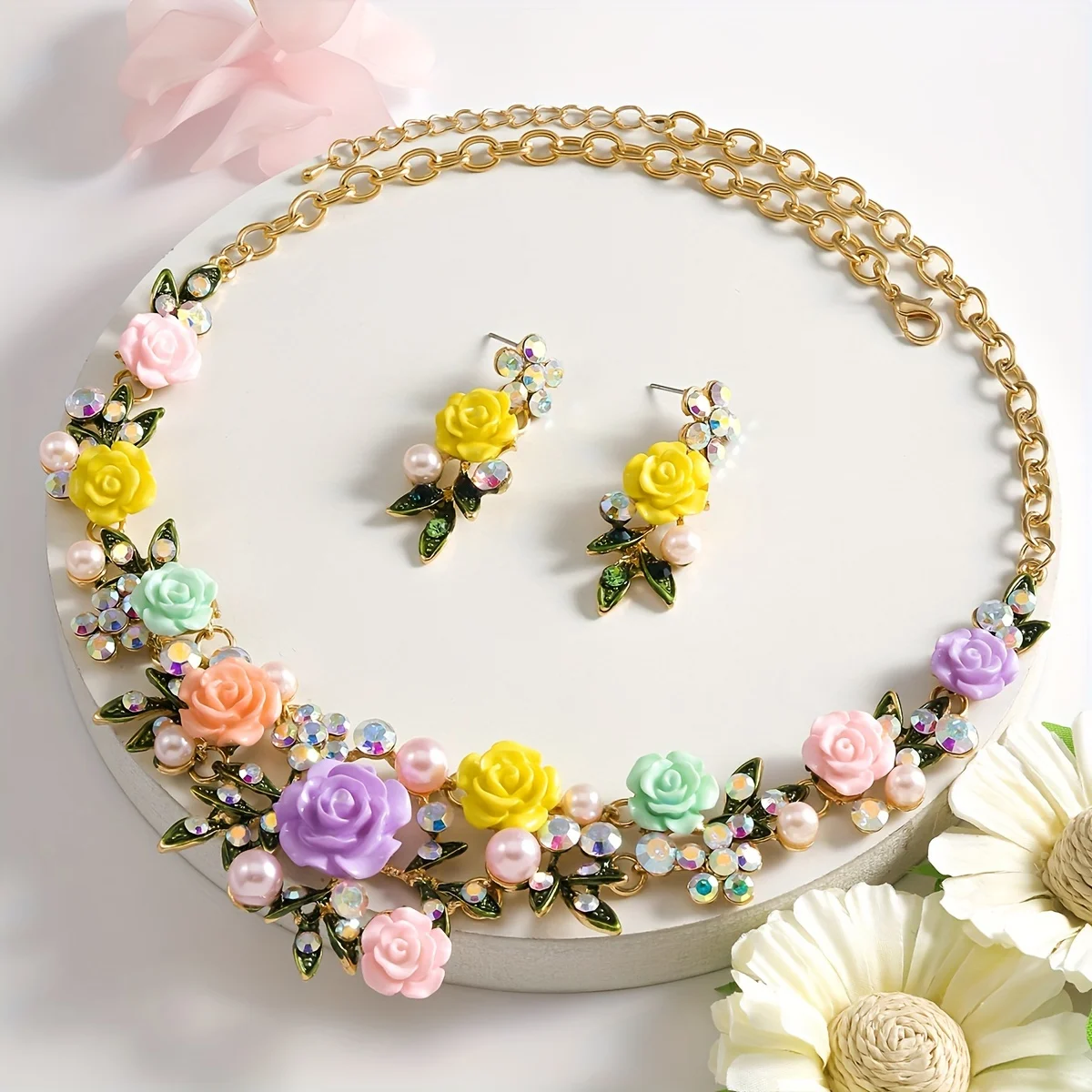 • Vedawas 3pcs/set Bohemian rose necklace earrings accessories set,Rhinestones imitation pearl wedding party lady accessories
