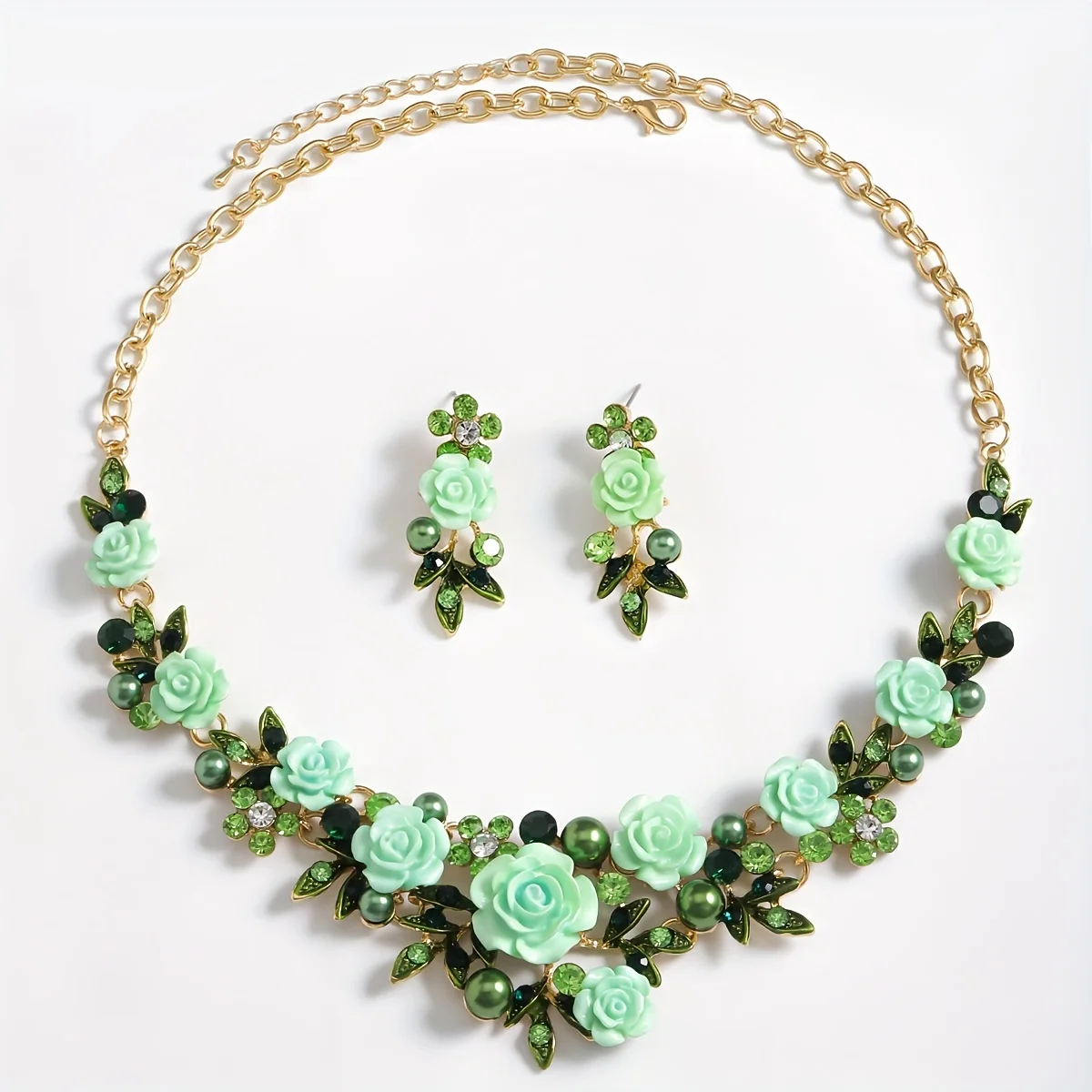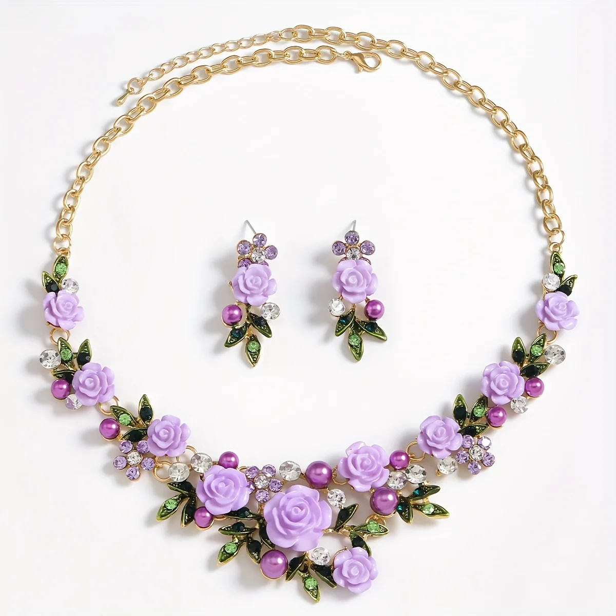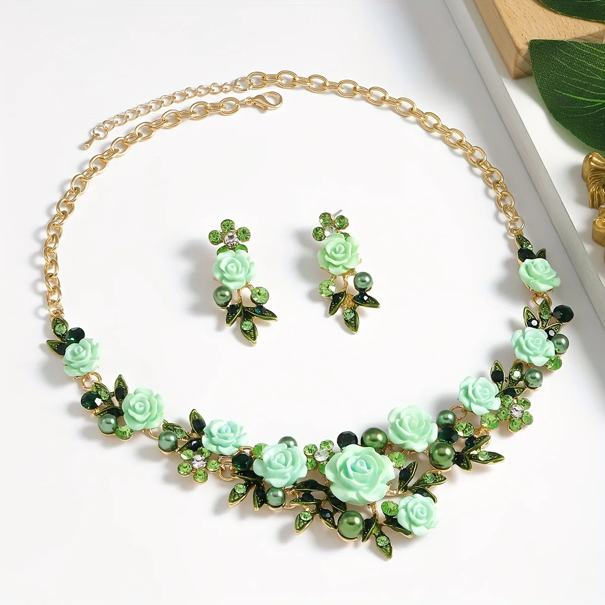 • Vedawas 3pcs/set Bohemian rose necklace earrings accessories set,Rhinestones imitation pearl wedding party lady accessories