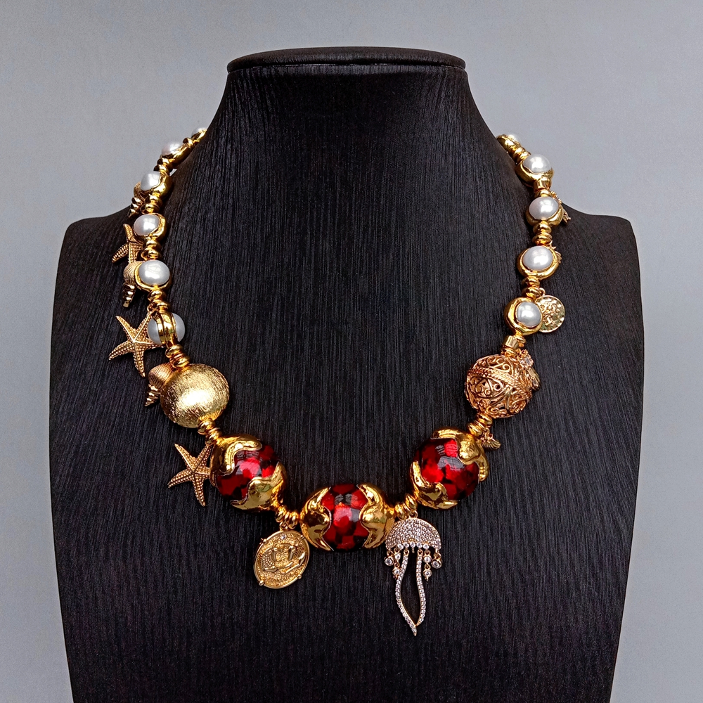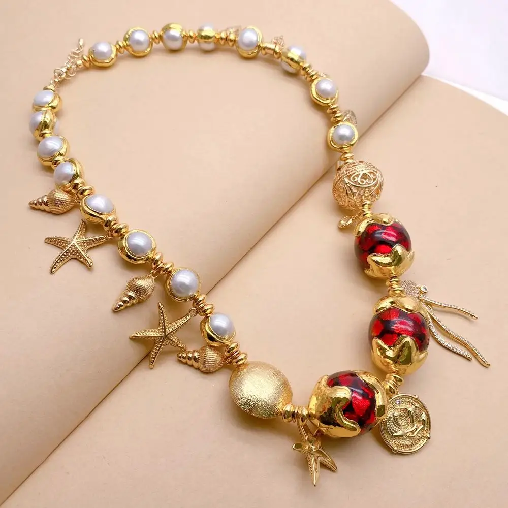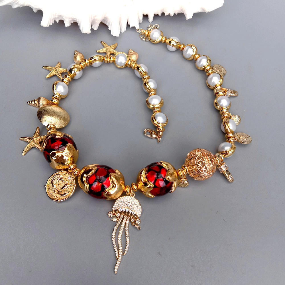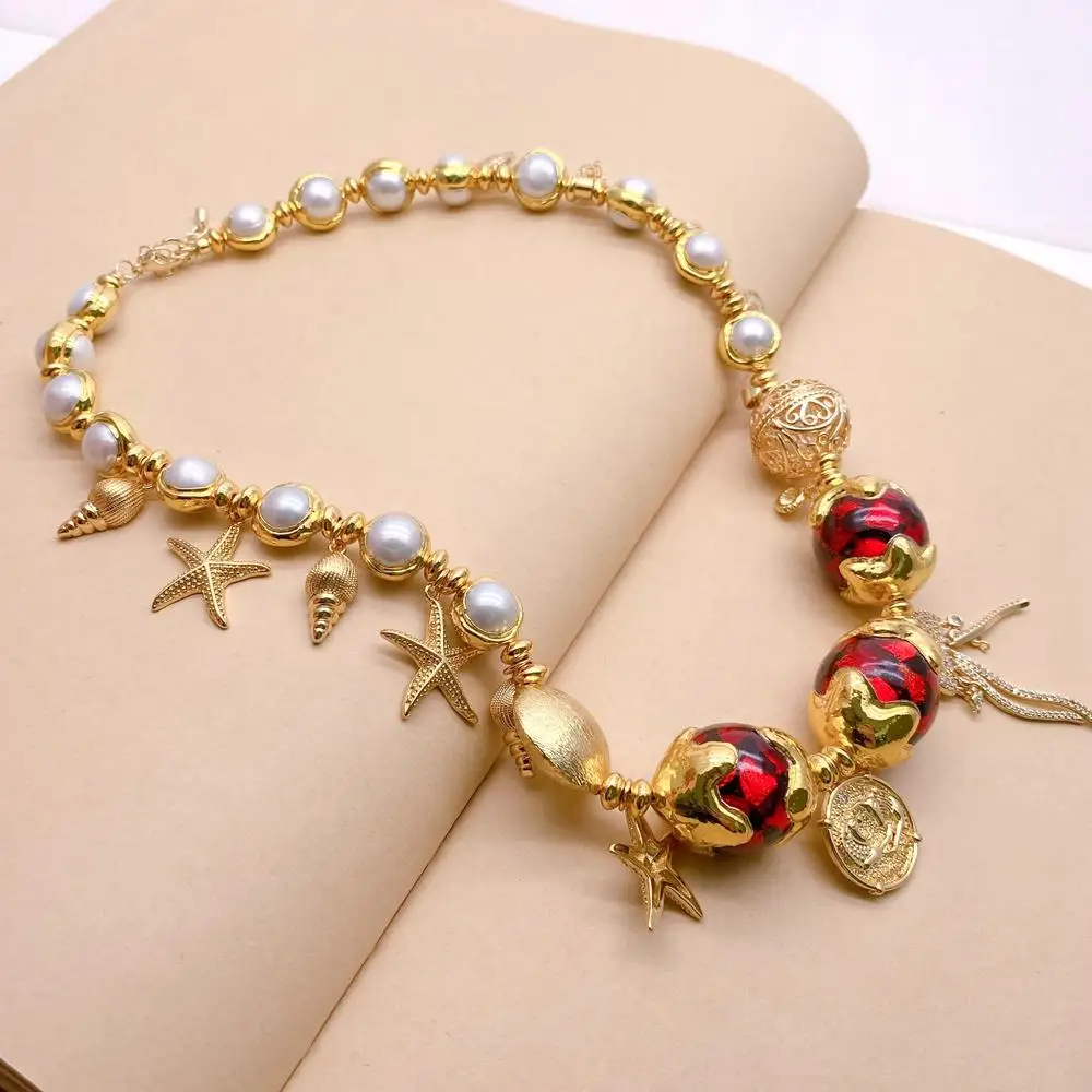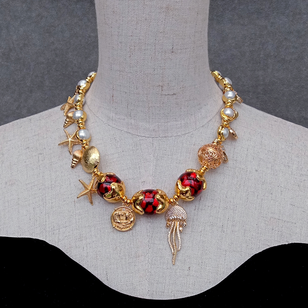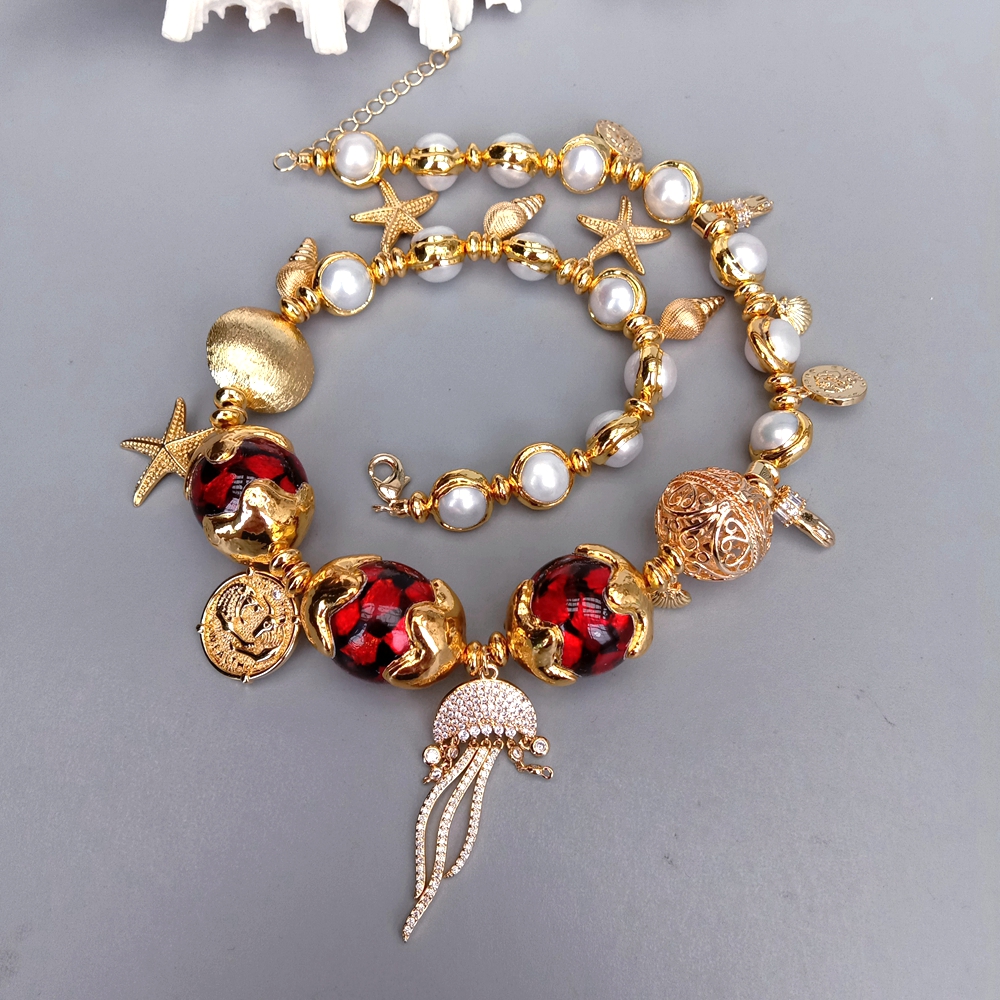 Gems Info: red murano glass with gold plated edge, cz pave charm, white cultured pearl.