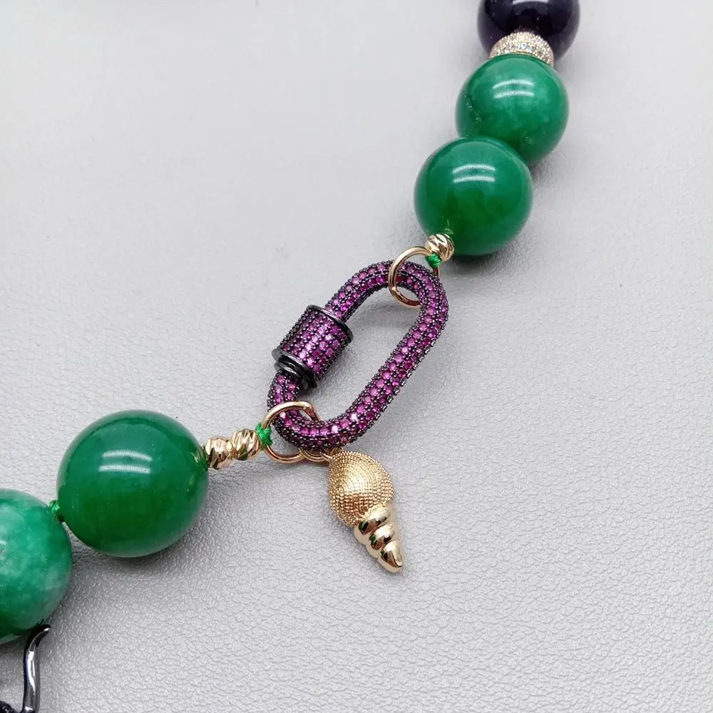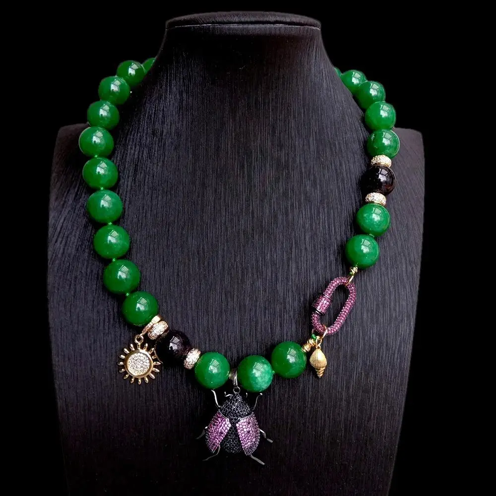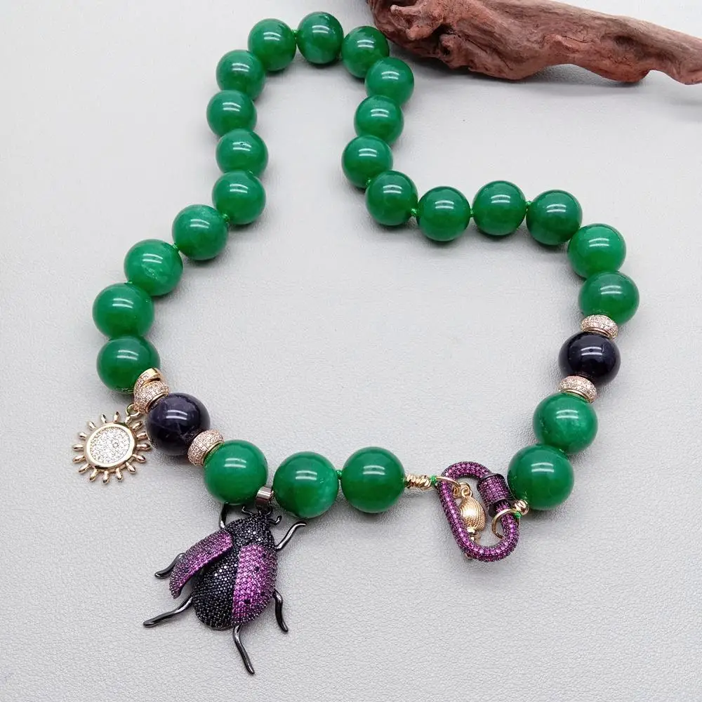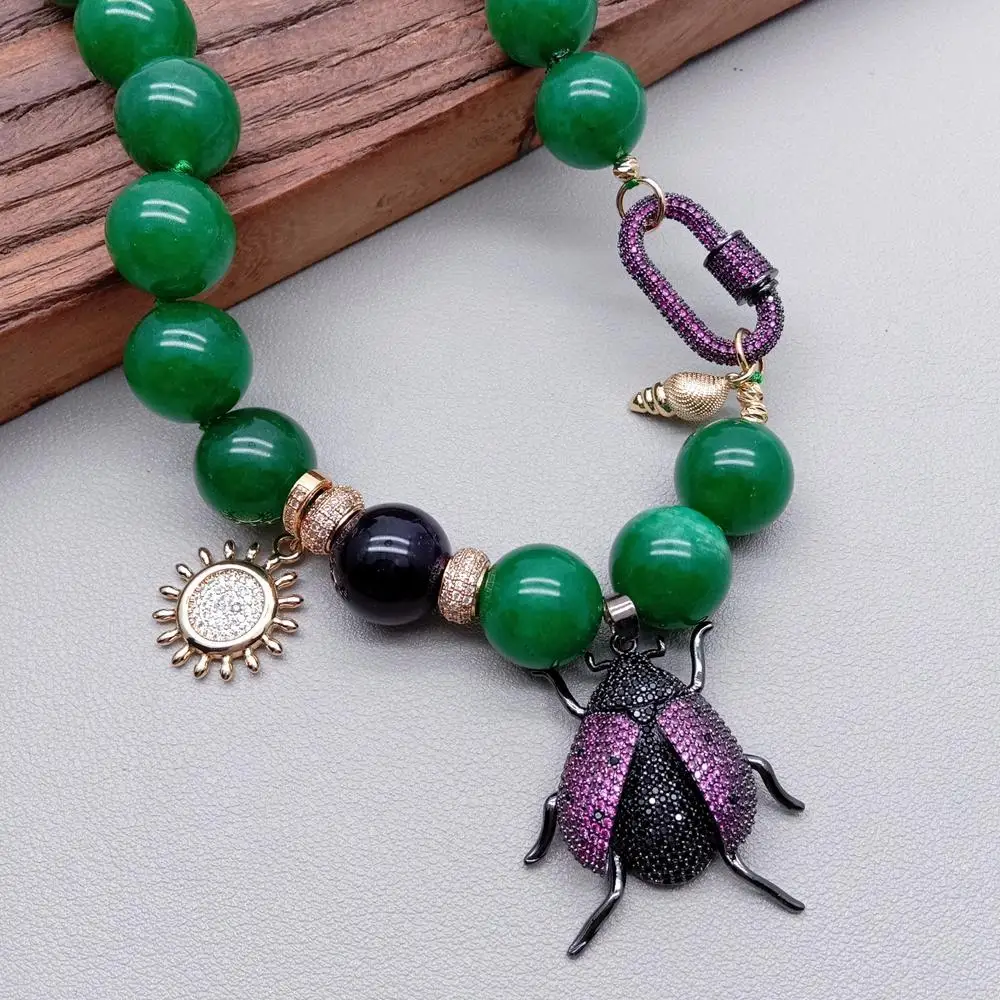 Gems Info: green jade, onyx bead, cz pave bettle pendant.