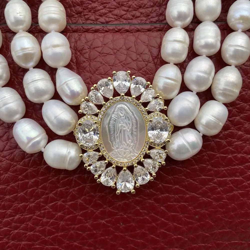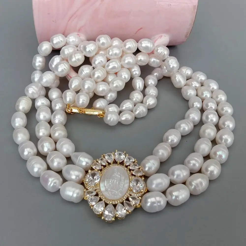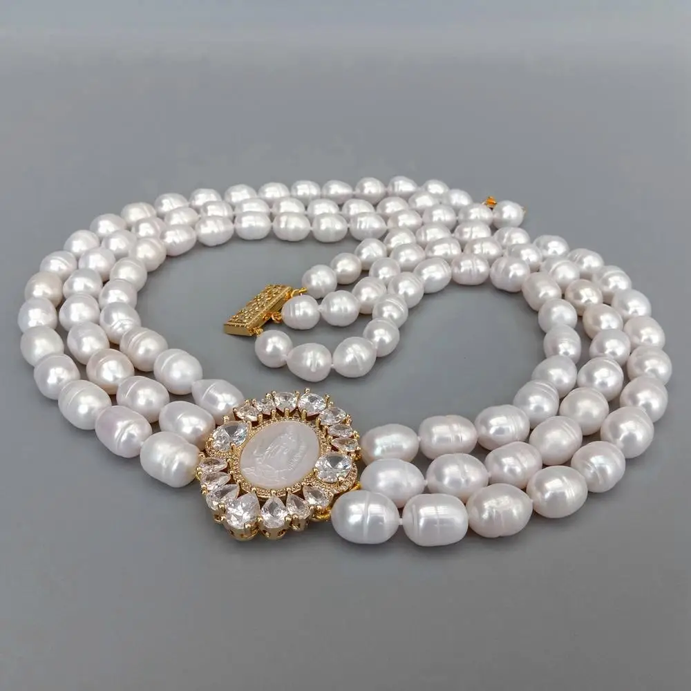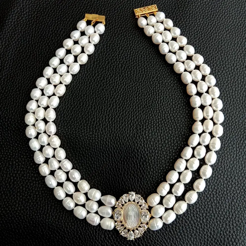 Multi Strands Pearl Necklace 3 Rows Freshwater Choker Necklace Cameo Shell Pendant Women Jewelry