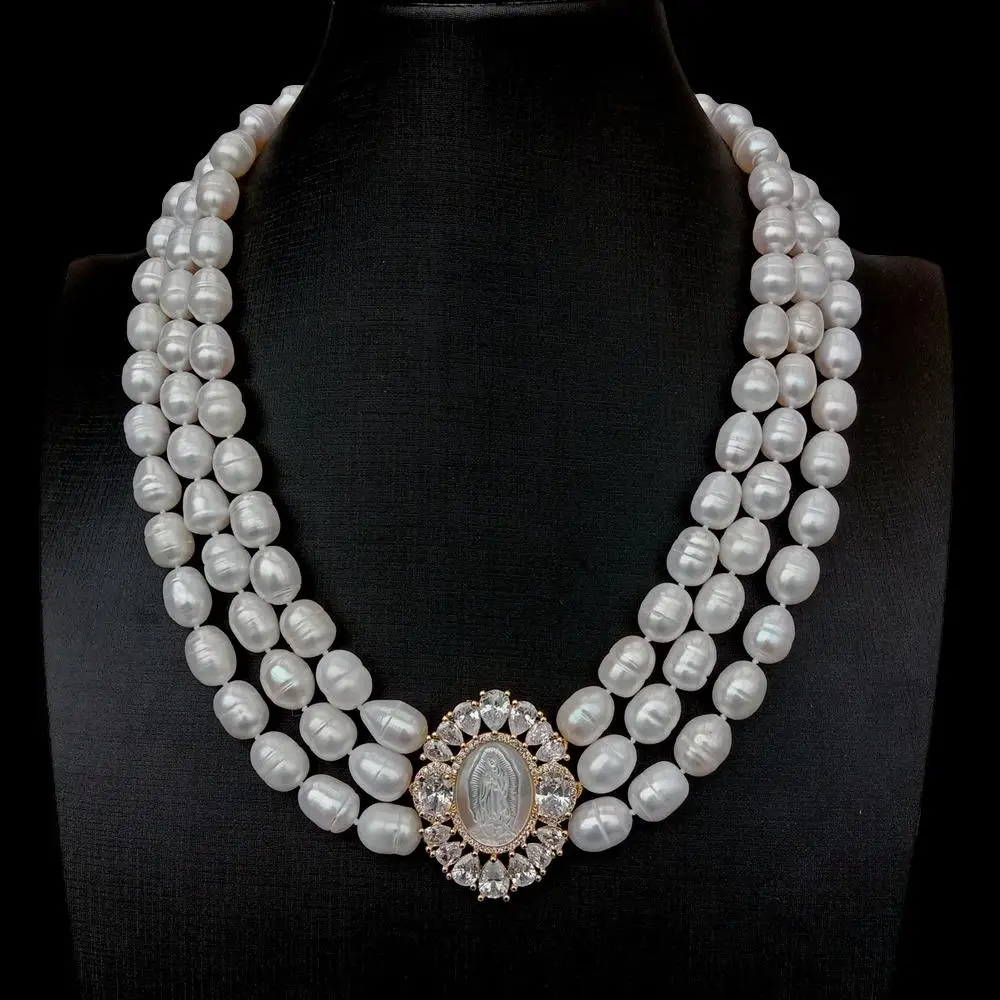 • Classic style Multi Strands Rice Pearl Necklace 3 Rows Freshwater Choker Necklace Cameo Shell Pendant Women Jewelry