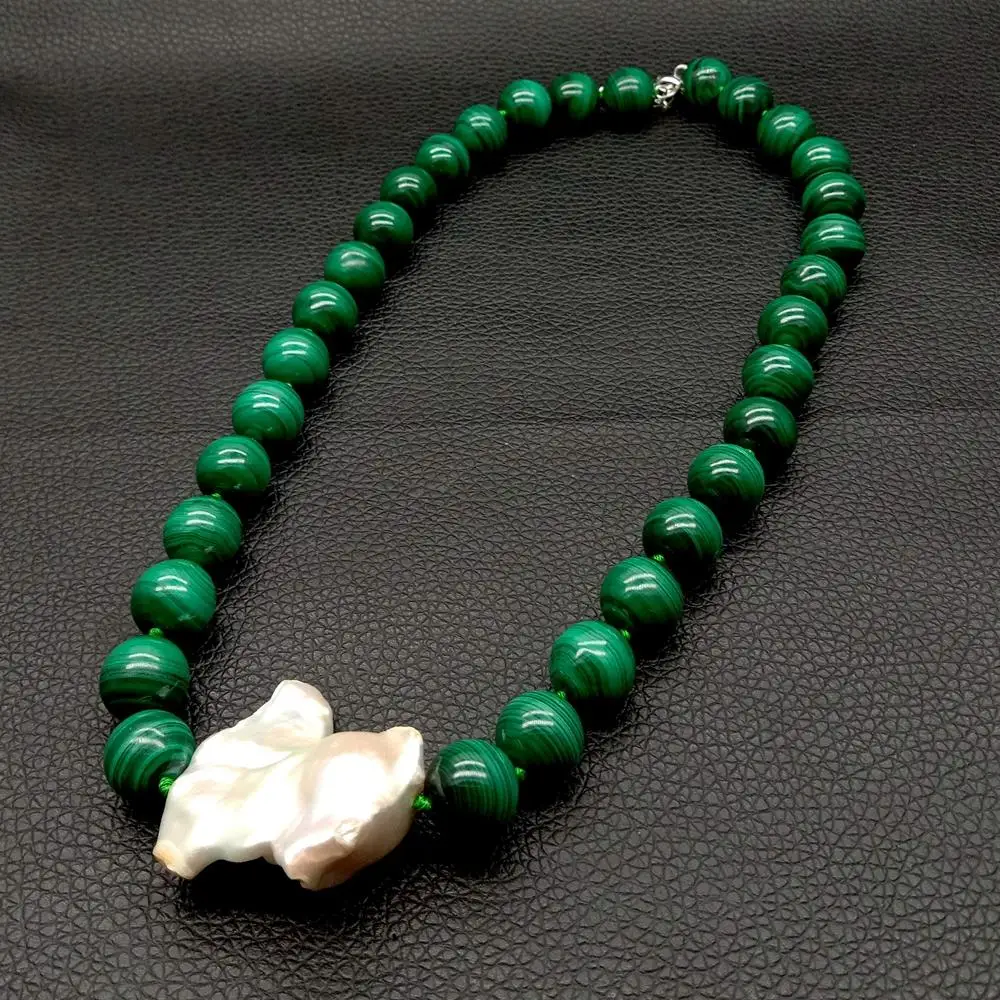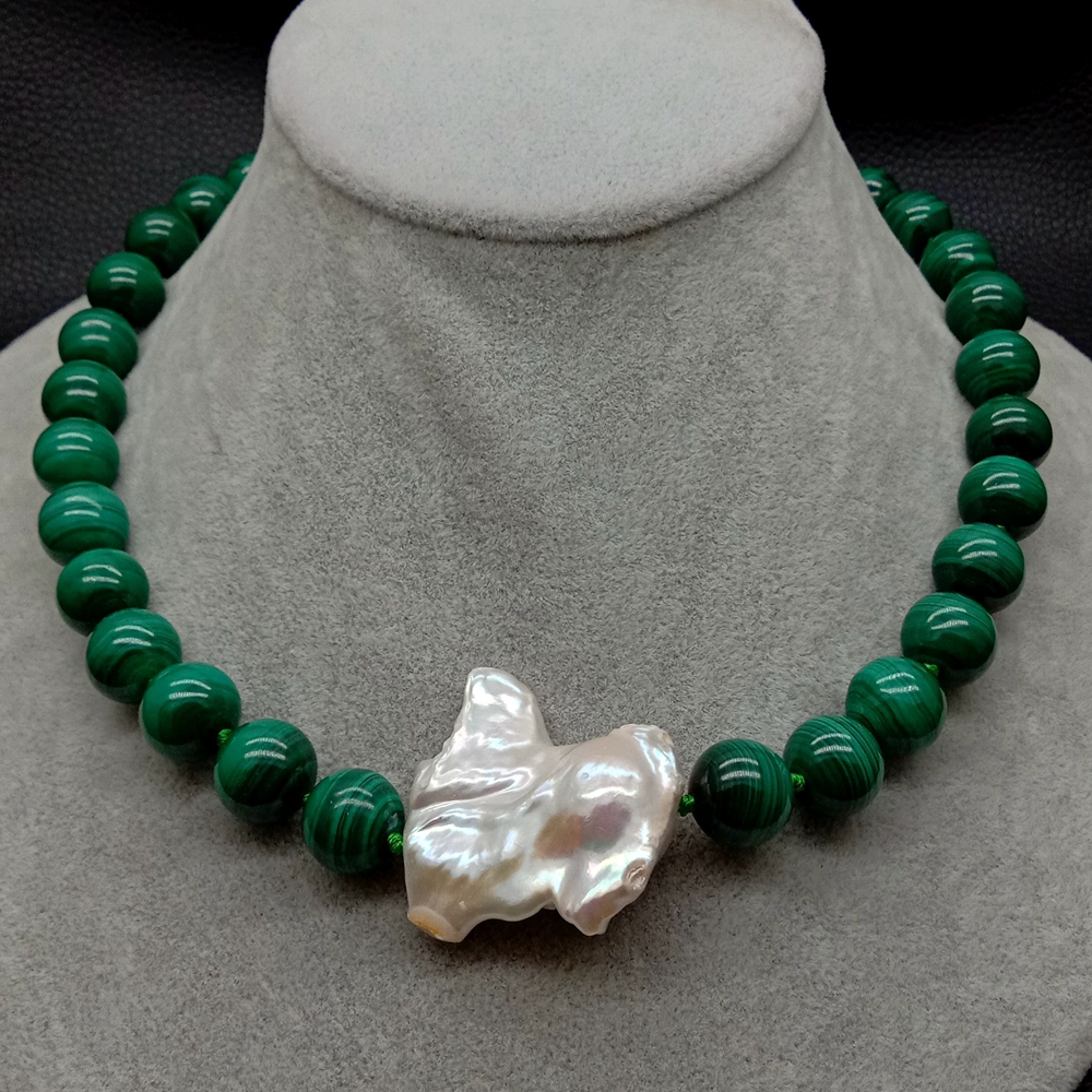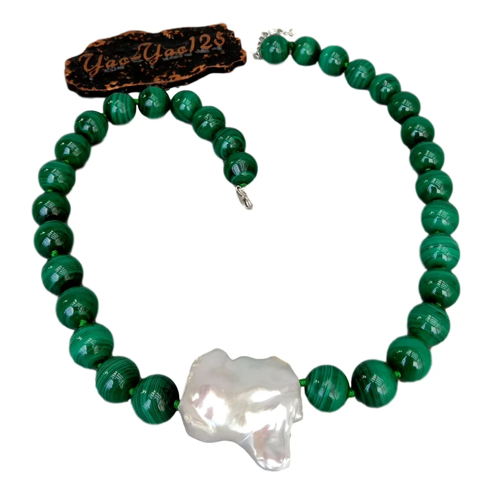 • Natural 12mm Genuine Round Green Malachite Freshwater White Keshi Pearl chokers Necklace for ethnic for women