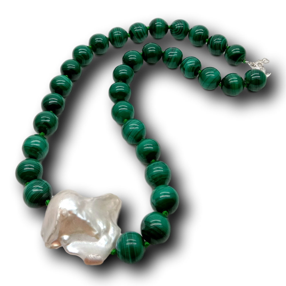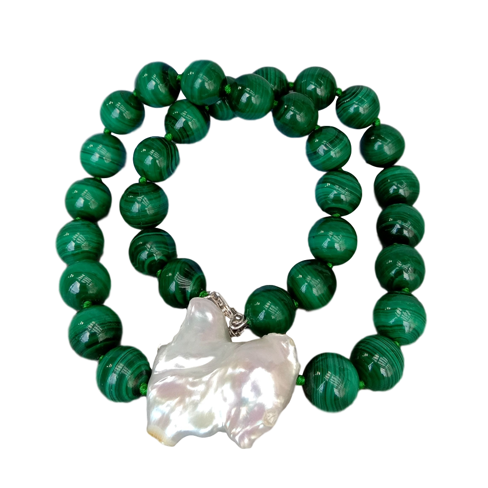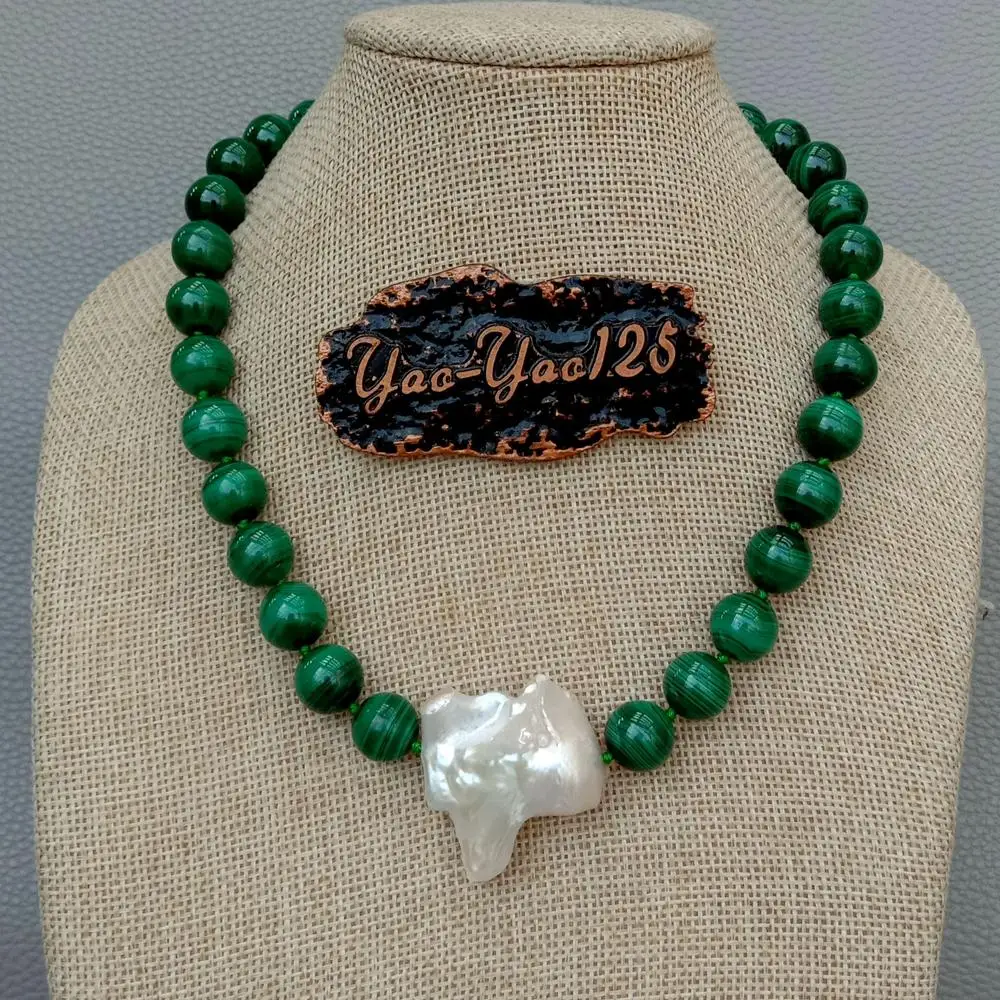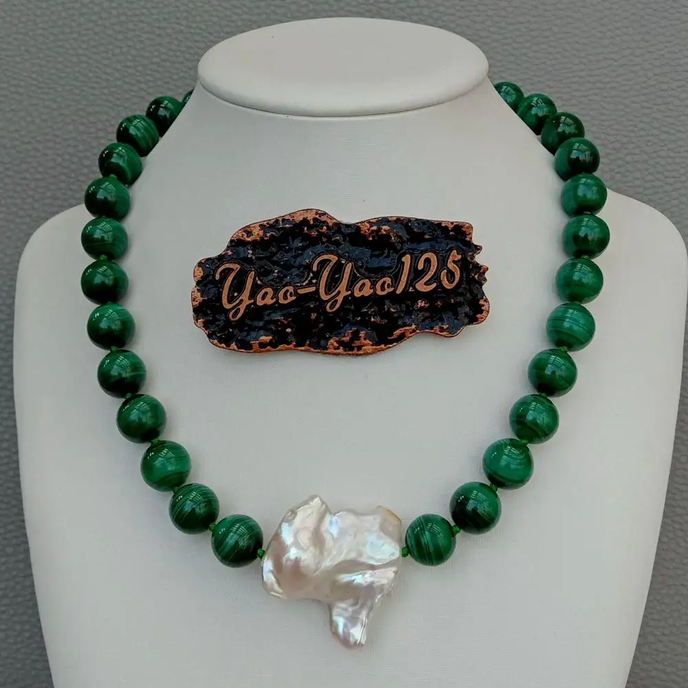 • Natural 12mm Genuine Round Green Malachite Freshwater White Keshi Pearl chokers Necklace for ethnic for women