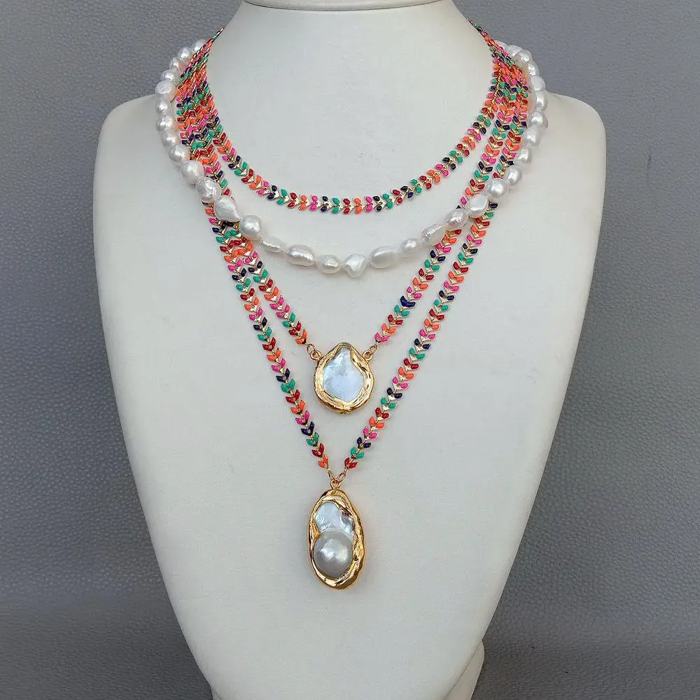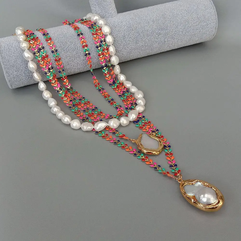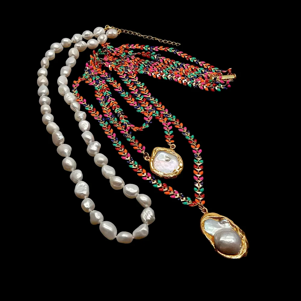 Gems Info: Fresh water cultured pearl, white baroque pearl, Multi Color Enamel Chain, white keshi pearl charm, good quality, high luster!
