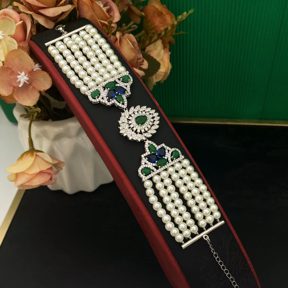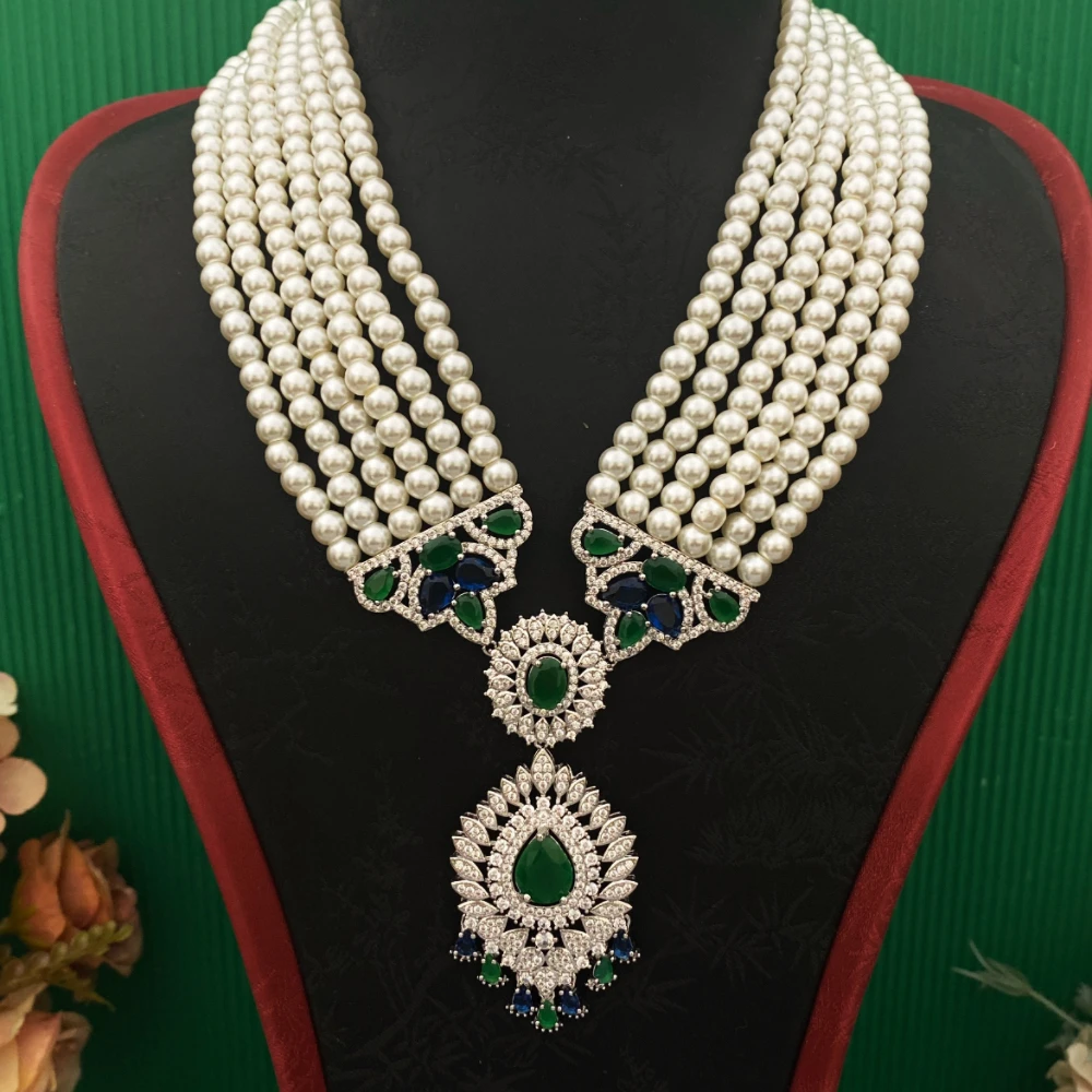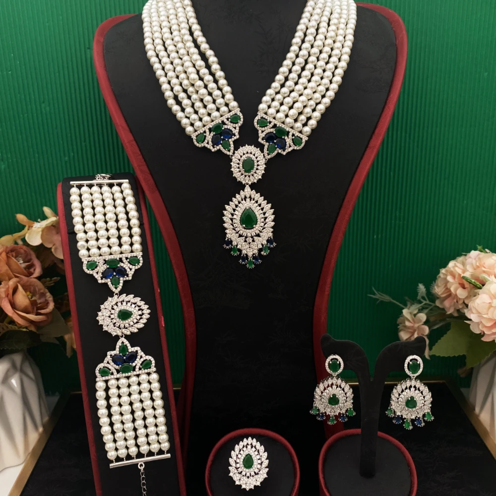 • Premium Zirconia Pearl Jewelry Set for Women Copper Necklace Earrings Bracelet Ring Sparkling Wedding Party Accessory
