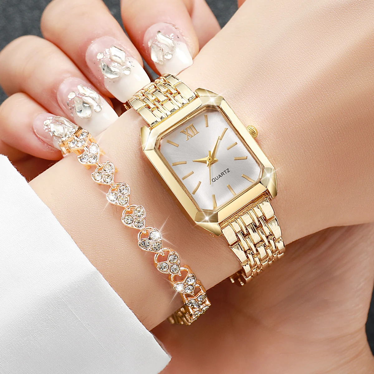 2PCS Fashion Rectangle Women Quartz Watch Rhinestone Bracelet Set Ladies Roma Dial Wristwatch Reloj Mujer Girls Clock Gift