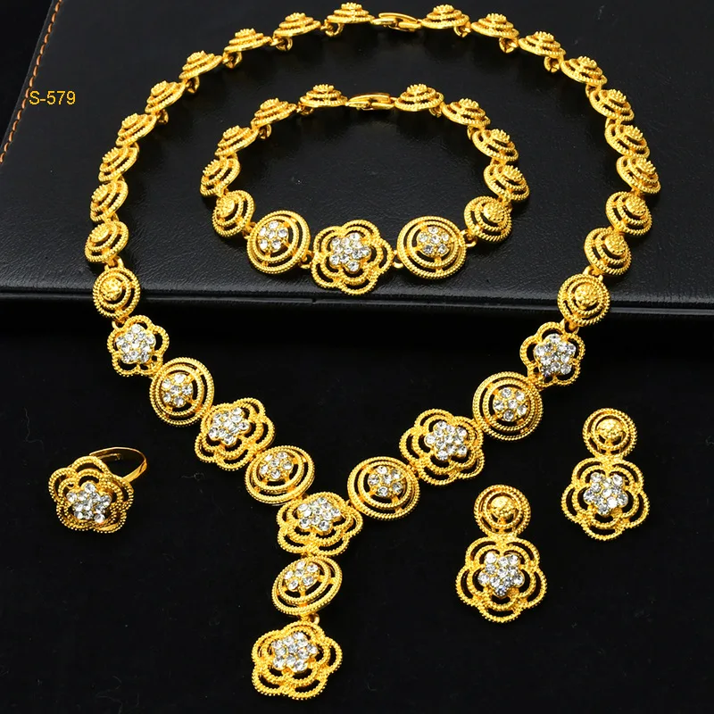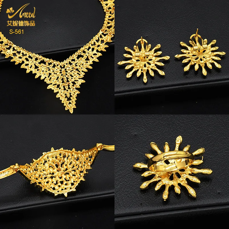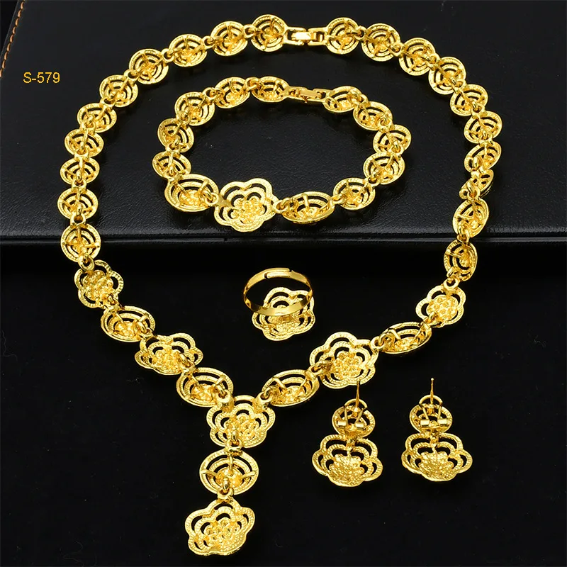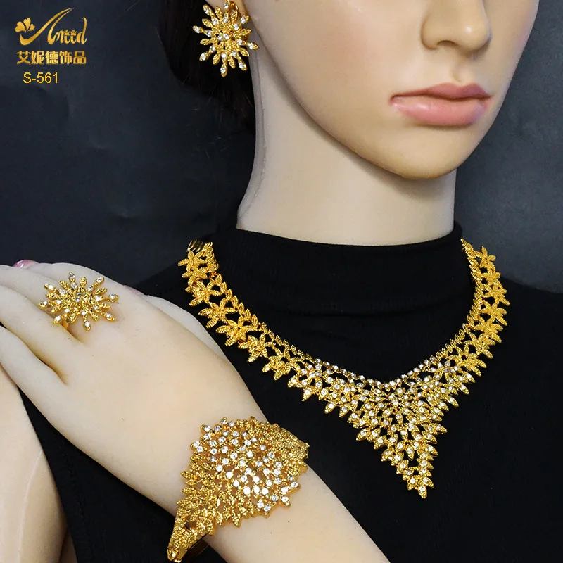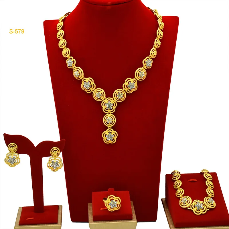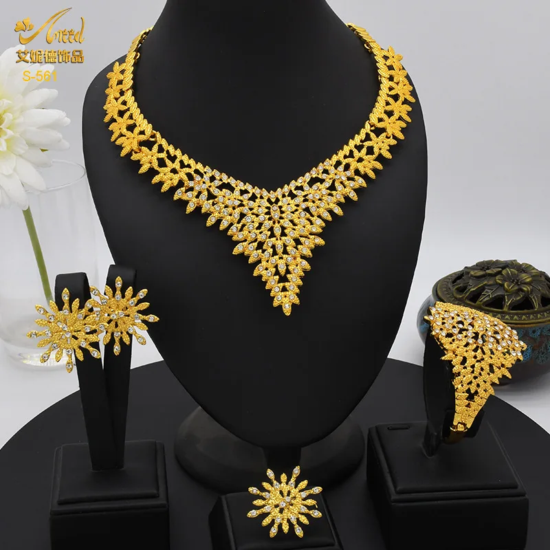 • Diamond-Studded Floral Elegant Necklace Bracelet Earrings Ring 4-Piece Set Women 24K Gold AU999 - Lightweight, stackable